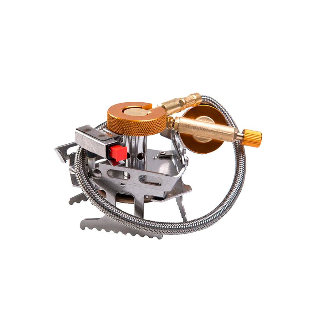 Apresenta mangueira de gás ligada ao cartucho pela porta de conexão, que fica separado do fogareiro, facilitando o manuseio da panela grandes e alimentos.
